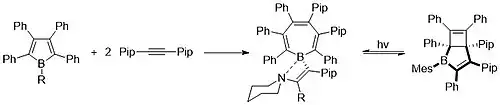 As a final note, in 2018 the Braunschweig group synthesized a valence isomer of borepin, shown below. This bicyclic, boron-containing heterocycle can be interconverted to its borepin isomer using pericyclic, photochemical reactions.[15]