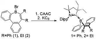 Most recently, in 2022 Gilliard et al. were able to apply similar principles from their cationic borepins to form and characterize the first instance of isolated borepin radicals. These radicals were also capable of being reduced to the first instance of a borepin anion where there is multiple bonding between a boron-carbon center.[16] The generation of the radical comes from the strong π-accepting ability of the carbene carbon. The electron density shared with the boron center back bonds slightly with the carbon atom, leading to the single-electron radical species.