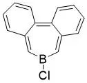 Most common example of phenyl-borepin fusion. Halide ion is present to showcase borepin before reactions with Lewis bases. Generic borepin on the left explains labeling of atoms for clarity.