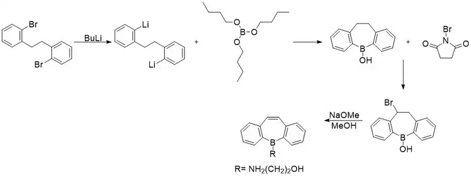 The first synthesis of a stable borepin was reported in 1960 by van Tamelen, Brieger, and Untch. The synthesis began with a lithiation of o,o’-dibromobibenzyl. Next it was reacted with tributyl borate to yield a fused borinic acid ring. This product was reacted with n-bromosuccinimide (NBS) to yield a bromo-substituted product. Finally, they performed a dehydrohalogenation to yield the borepin ring system seen above.[10] A method similar to this involving a tin-boron exchange is commonly used in modern synthesis of fused borepin systems.[11]