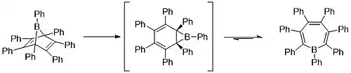 6. 1 2 3 4 5 Eisch, John J.; Galle, James E. (July 1975). "Rearrangements of organometallic compounds. XIII. Boraaromatic systems. IV. Synthesis of heptaphenylborepin via the thermal rearrangement of heptaphenyl-7-borabicyclo[2.2.1]heptadiene". Journal of the American Chemical Society. 97 (15): 4436–4437. doi:10.1021/ja00848a070.