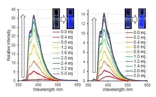 Figure shows fluorescence output of anthracene-substituted tetracyclic borepins upon titration with increasing equivalents of tetrabutylammoniumfluoride (TBAF). Increase of intensity correlates positively between compounds as TBAF is added.[24]