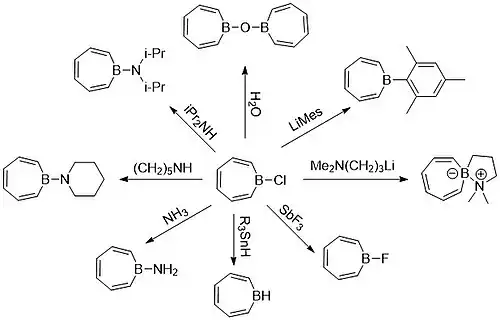 13. 1 2 3 Ashe, Arthur J.; Klein, Wolfram; Rousseau, Roger (August 1993). "Evaluation of the aromaticity of borepin: synthesis and properties of 1-substituted borepins". Organometallics. 12 (8): 3225–3231. doi:10.1021/om00032a051.