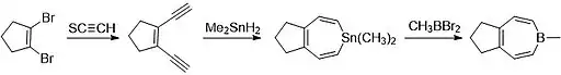 More recently a method for a minimally substituted borepin was developed by Ashe and Drone. They proceeded from 1,2-dibromocyclopentene and performed a van der Kerk method for boron heterocycle preparation. Next, they initiated a ring closure to form a 7-membered tin complex. Finally, they completed a tin-boron exchange reaction to afford the bicyclic borepin on the right.[2][14]