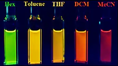 Fluorescence is not only limited to outside coordination. Upon insertion of nitrogen into the borepin ring, Li et al. were able to observe solvatochromic effects. Upon addition of the borepin to hexanes, toluene, tetrahydrofuran (THF), dichloromethane (DCM) and acetonitrile (MeCN), rather drastic changes in color were observed.[9]
