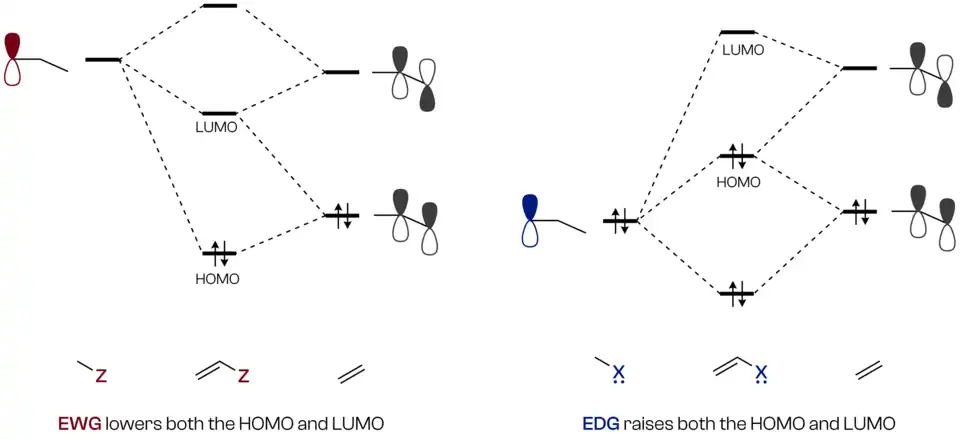 The orbital energetics are highly tunable via substituent effects: electron-withdrawing groups lower the HOMO energy, whereas electron-donating groups raise the LUMO energy, as shown in Figure 4.[9] Characterized borirenes to date are stabilized predominantly by electron-rich, strong σ- and π-donor substituents that raise the LUMO and lowers the HOMO energy. Due to their inherent reactivity, sterically demanding groups such as m-terphenyl or mesityl substituents are commonly employed to enhance kinetic stability.