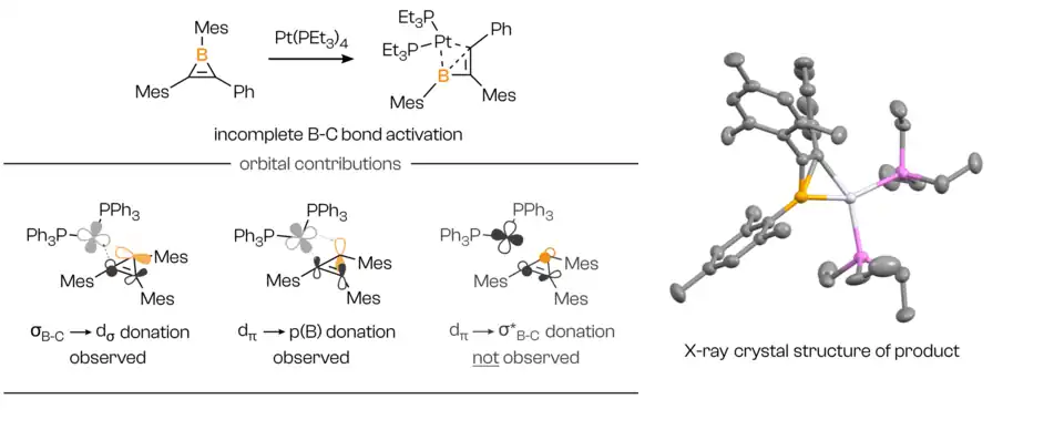 Borirenes exhibit promising potential as ligands. For example, introducing an electron-rich metal complex, such as tetrakis(triethylphosphine)platinum(0), to a borylene complex induces B–C σ-bond coordination instead of cleavage.[24] This is shown in Scheme 3. The platinum fragment benefits from strong σ- and π-donation from the σ-framework and moderate π-acceptance from the π-framework. Notably, no dπ−σ*B-C interaction is observed, indicating that B−C bond activation is unfavorable.