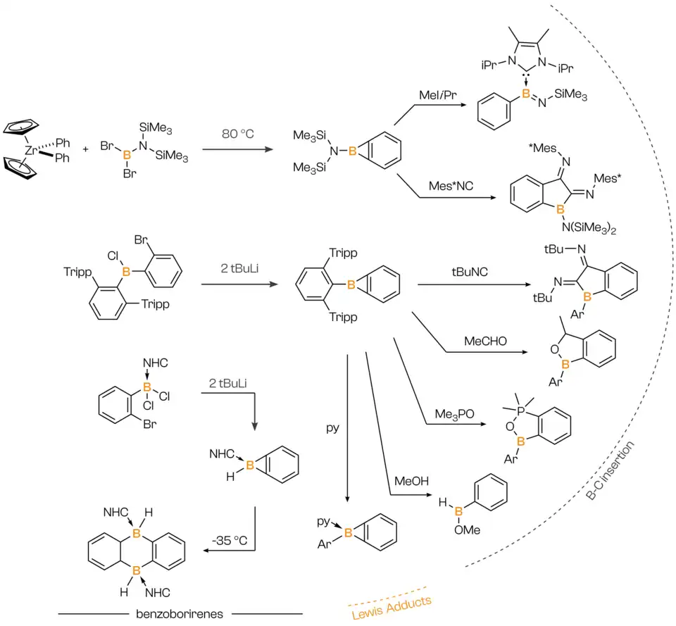 - 1 2 3 Wang, Junyi; Ye, Qing (2024-02-21). "Borirenes and Boriranes: Development and Perspectives". Chemistry – A European Journal. 30 (11): e202303695. doi:10.1002/chem.202303695. ISSN 0947-6539. PMID 38085103.