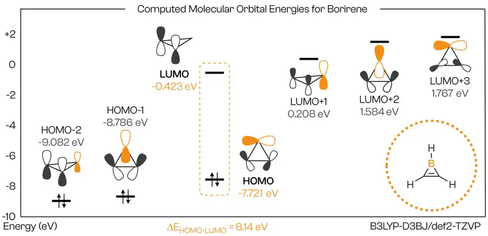 Seven molecular orbitals are depicted in Figure 3. For the simplest borirene, C2H3B, the two highest occupied molecular orbitals (HOMOs) are from the σ-framework, while the two lowest unoccupied molecular orbitals (LUMO) are from the π-framework. Substituting one carbon atom with boron, due to its lower electronegativity, disrupts degeneracy. With σ- and π- orbitals close in energy, the HOMO−1 and HOMO (from the σ-framework) can act as a π-donor and σ-donor, respectively, while the LUMO and LUMO+1 serve as both σ-acceptors and π-acceptors. A detailed computational study on borirenes by Paul von Ragué Schleyer and coworkers have predicted these molecules to undergo facile dimerization into 1,4-diboracyclohexadiene.[11]