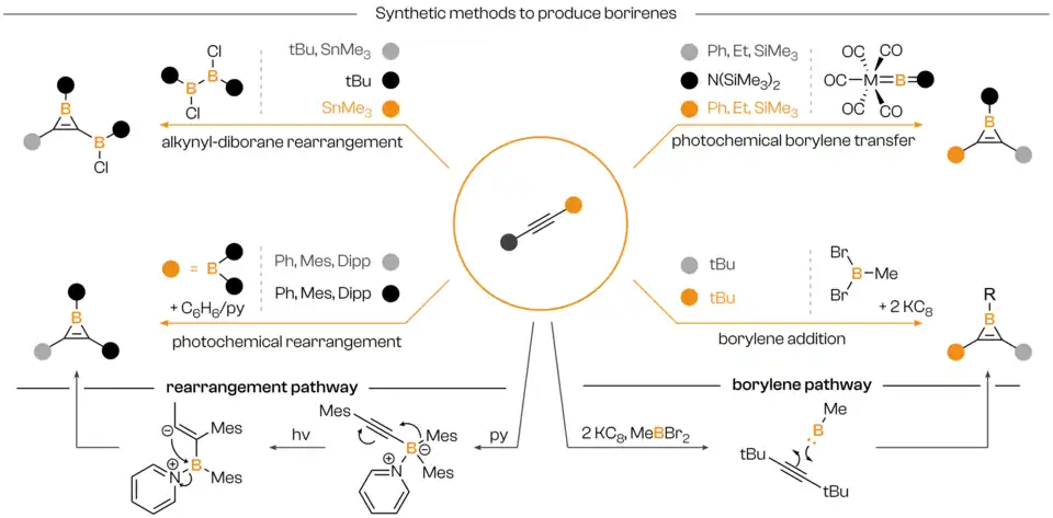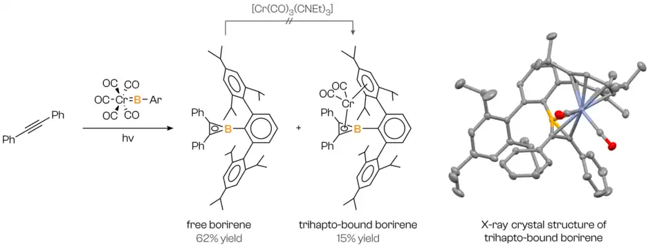 - ↑ Braunschweig, Holger; Herbst, Thomas; Rais, Daniela; Seeler, Fabian (2005-11-18). "Synthesis of Borirenes by Photochemical Borylene Transfer from [(OC) 5 MBN(SiMe 3 ) 2 ] (M=Cr, Mo) to Alkynes". Angewandte Chemie International Edition. 44 (45): 7461–7463. doi:10.1002/anie.200502524. ISSN 1433-7851. PMID 16231387.