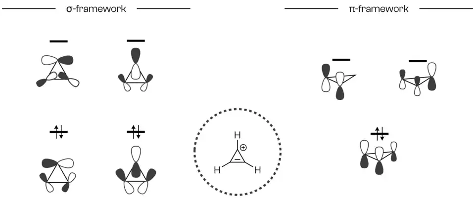 Although 2π Hückel aromaticity stabilizes the π-framework, three-membered ring systems like cyclopropane experience significant ring strain with bond angles of approximately 60°, deviating significantly from the 120° angles typical of sp2-hybridized carbons. This strain limits 2s-2p orbital mixing, and the σ-framework have significant π-character in terms of reactivity.[10] This leads to the energies of both frameworks being relatively close in energy, leading to interesting interactions overall. From the isolobal principle, we can expect the bonding properties to be similar in borirenes: