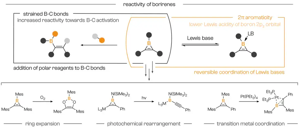 Similar to other tricoordinate boron compounds, borirenes readily form Lewis adducts.[6][7][8] Strong Lewis bases like N-heterocyclic carbenes (NHCs) bind efficiently to borirenes but can be displaced by introducing stronger Lewis acids, such as tris(pentafluorophenyl)borane.[6] Pyridine has also been shown to bind reversibly to borirenes, illustrating the milder Lewis acidity of borirenes due to the aromatic π-framework.[6] In cases where the boron atom is directly bonded to a metal fragment capable of functioning as a leaving group—such as FeCp*(CO)2—two equivalents of NHCs can displace the metal fragment, resulting in a formally positively charged tetracoordinate boron center, with [FeCp*(CO)2]− acting as the counteranion.[7]