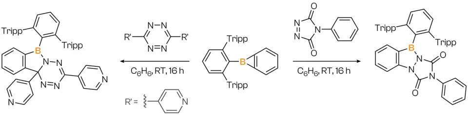 - ↑ Sindlinger, Marvin; Biebl, Sonja; Ströbele, Markus; Bettinger, Holger F. (2024). "Formal (2+2) ring expansion prevails over (4+2) cycloaddition of a kinetically stabilized benzoborirene with reactive cycloaddends". Chemical Communications. 60 (73): 9986–9989. doi:10.1039/D4CC02888K. ISSN 1359-7345. PMID 39175434.
