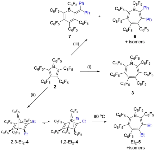 The small HOMO-LUMO gap of boroles makes them eminently suitable as Diels–Alder participants. The reaction of [PhBC4Ph4] (1) with diphenylacetylene to afford aromatic heptaphenylborepine has been reported by Eisch et al. in the “paradigm of pericyclic reactions”.[26] Recently, the interest in this reaction pathway was revived by Piers et al.., who studied the reactivity of perfluorinated [PhBC4Ph4] (2 in the figure above) towards alkynes in great detail.[27] Of particular relevance was the question of whether the enhanced Lewis acidity of 2 compared 1 affects its reactivity and whether that entails novel reactivity patterns. In that study, 2 was reacted with three differently substituted alkynes that greatly differed in their electronic properties, namely (C6F5)CC(C6F5), (C6H5)CC(C6H5) and Et–CC–Et.