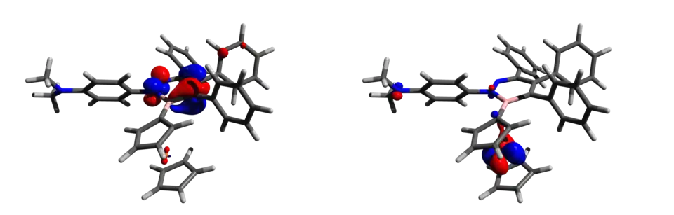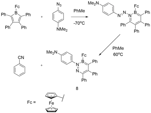 The highly reactive nature of boroles also leads to them participating in ring expansion[28] reactions upon reaction with azides.[29] In the reaction of 1-(2,3,4,5-tetraphenylborolyl)ferrocene[4] with 4-azido-N,N-dimethylaniline to generate a new species (8 in the figure above). Cyclic voltammetry studies indicated that the 1,2,3-diazaborinine exhibits similar electronic effects to that of pyridine, which makes (8) weakly electron-withdrawing. Analyses of the frontier molecular orbitals using DFT shows that the HOMO mainly comprises the iron dx2-y2 orbital while the LUMO resides largely on the BN pyridine ring as an antibonding π* orbital. As (8) contains two nucleophilic nitrogen lone pairs, NBO calculations were performed to assess the charges at nitrogen and determine which might be the more reactive. Results show that the partial charges of the pyridine and dimethylamino nitrogen atoms are -0.232 and -0.446 respectively, suggesting a larger accumulation of electron density on the latter group which should make it the more reactive nucleophile.