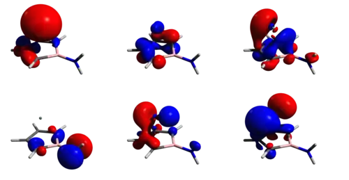 Furthermore, synthetic evidence for a neutral η5-aminoborole germanium(II) complex half sandwich has been reported[32] as illustrated to the right. Tholen et al. performed DFT calculations at the M06-2X/Def2-TZVP level of theory and determined that the model complex matched up closely with experimental data determined experimentally by X-Ray Diffraction (XRD), with a maximum of 1.6% deviation in atomic distances and angles. Using the model compound, its frontier orbitals were calculated and they reveal covalent bonding interactions between the apical germanium atom and the borole base. As shown in the figure to the right, the HOMO is mainly located at the nitrogen atom while HOMO-1 and HOMO-2 are bonding combinations of germanium 4px and 4py orbitals with the π orbitals of the borole ring. HOMO-3 is the antibonding combination of mainly the germanium 4s and 4pz orbitals and the lowest π orbital of the borole ring.