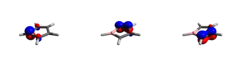 A simple Hückel model can be used to compare the spectroscopic properties and observed reactivity of boroles against the isoelectronic cyclopentadienyl cation [C5H5]+. Unlike [C5H5]+ which has a doubly degenerate pair of HOMOs, the introduction of a boron center lifts their degeneracy by increasing the energy of the antisymmetric molecular orbital somewhat and the symmetric molecular orbital significantly. As a result, the HOMO in boroles is doubly occupied and no biradical character is observed, in line with a singlet ground state and the diamagnetic character of boroles. Furthermore, boroles exhibit a small HOMO–LUMO gap (principally consisting of a π–π* transition) and the lowest-energy electronic absorption of boroles is considerably red shifted in the UV-Vis spectra (e.g. [PhBC4Ph4]: λmax = 560 nm). Accordingly, boroles exhibit a characteristic blue color.