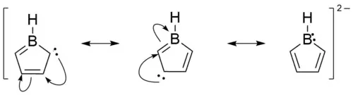 As the boron has an empty p orbital, boroles tend to accept 2 electrons in order to have 6 π electrons and gain aromaticity. This reduction to borolediides was demonstrated in the early 1980s by Herberich et al. with the isolation of K2[PhBC4Ph4].[7] Because the atomic orbitals of boron are different from those from carbon in terms of energy, not all atoms contribute equally to the π system in the borole dianion. A Natural Resonance Theory (NRT) calculation[6] shows that there are 3 dominant resonance structures for the isolated [C4BH5]2− dianion as illustrated below.