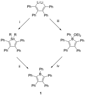 The first borole derivative to be isolated was pentaphenylborole [PhBC4Ph4], synthesised by Eisch et al. in 1969 as a deep blue solid.[10] Referring to the figure below, the practical synthesis of [PhBC4Ph4] (1) was initially accomplished in two different ways:[10][7][11] (a) by direct reaction of 1,4-dilithio-1,2,3,4-tetraphenylbutadiene with PhBBr2 which gives a Lewis base adduct of pentaphenylborole (1·OEt2) in diethylether, and subsequent removal of the solvent. (b) By boron–tin exchange between 2,3,4,5-tetraphenylstannole derivatives with PhBCl2.[12] Eisch et al. have demonstrated that the latter method can be expanded to other borole derivatives, even though these species have only been generated in situ.