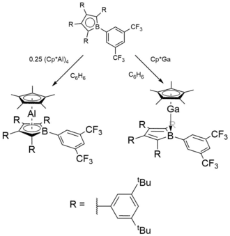 Boroles have been experimentally shown to form stable complexes other group 13 elements, such as aluminium and galium.[6] Both were synthesised from the neutral substituted borole and the corresponding metal (I)-Cp* complex in benzene as summarised in below.