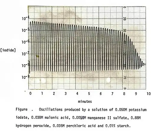 - ↑ W. C. Bray (1921). "A Periodic Reaction in Homogeneous Solution and Its Relation to Catalysis". J. Am. Chem. Soc. 43 (6): 1262–1267. doi:10.1021/ja01439a007.