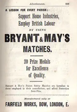 Bryant & May was formed in 1843 by Quakers William Bryant and Francis May to trade in general merchandise. In 1850 the company entered into a relationship with the Swedish match maker Johan Edvard Lundström in order to capture part of the market of the 250 million matches that were used in Britain each day. Its first order was for 10 or 15 cases of 720,000 matches (composed of 50 gross boxes of 100 matches each). The next order was for 50 cases; later orders were for 500. This partnership was successful, so the partners decided to merge the firm with a separate company owned by Bryant, Plymouth-based Bryant and James.[1] The company began production after purchasing the rights in Britain for £100.[2][3][a] In line with their religious beliefs, Bryant and May decided to produce only safety matches, rather than lucifers.[5] In 1850 the company sold 231,000 boxes; by 1855 this had risen to 10.8 million boxes and to 27.9 million boxes in 1860.[3] Market preference in the UK was for the familiar lucifer match, and by 1880 Bryant & May were also producing them.[2] The same year the company began exporting their goods; in 1884 they became a publicly-listed company. Dividends of 22.5 per cent in 1885 and 20 per cent in 1886 and 1887 were paid.[6]