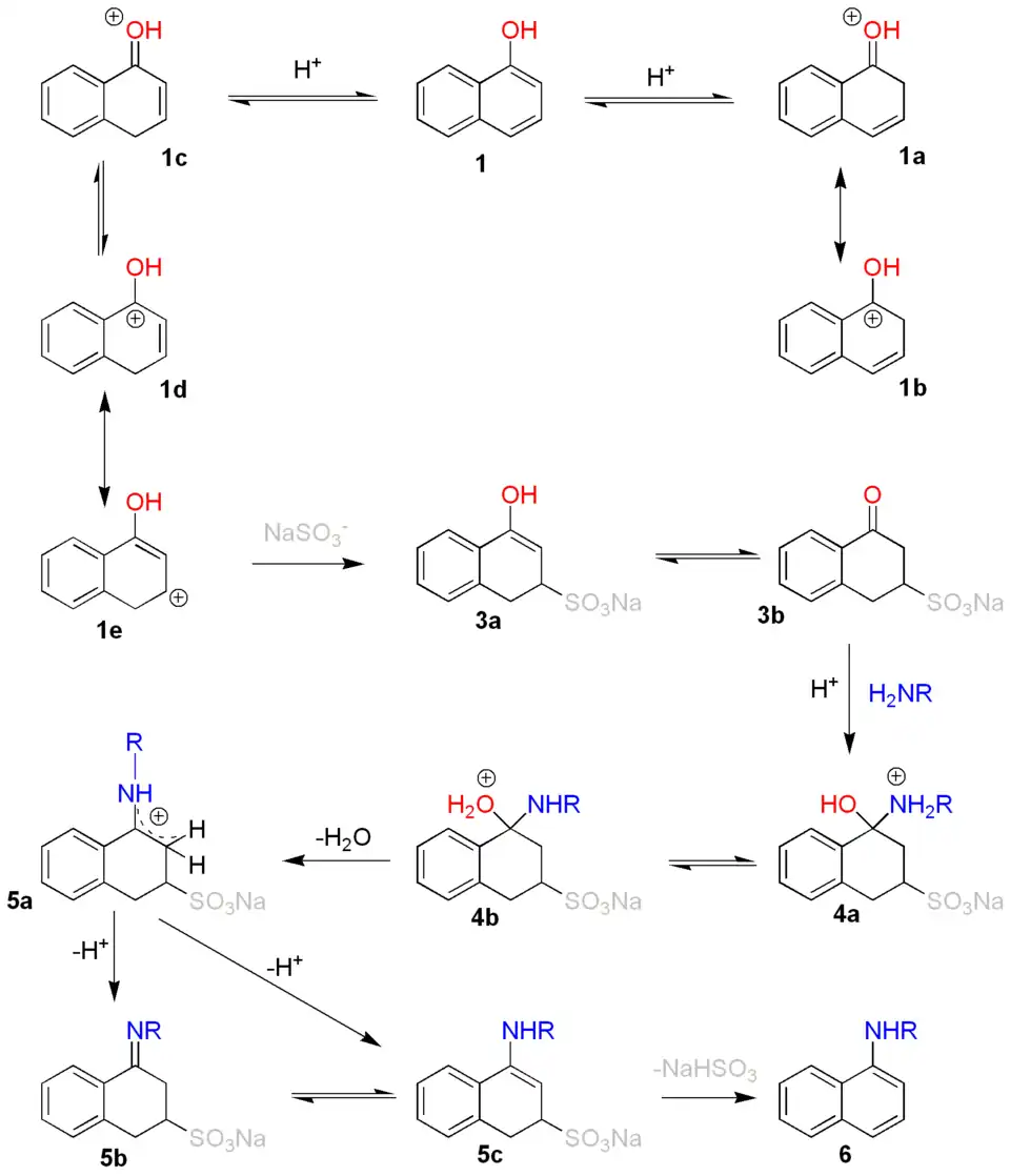 De-aromatization of the first ring of the naphthalene system occurs at the expense of 25 kcal/mol. In the next step a bisulfite anion adds to C3 through 1e. This results in the formation of 3a which tautomerizes to the more stable 3b to the sulfonic acid of tetralone. A nucleophilic addition follows of the amine with formation of 4a and its tautomer 4b loses water to form the resonance stabilized cation 5a. This compound is deprotonated to the imine 5b or the enamine 5c but an equilibrium exists between both species. The enamine eliminates sodium bisulfite with formation of naphthylamine 6.