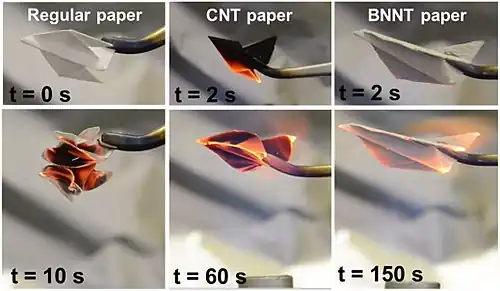 - Fire protection: covering material with a thin layer of buckypaper significantly improves its fire resistance due to the efficient reflection of heat by the dense, compact layer of carbon nanotubes or carbon fibers.[10]