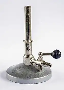 A Bunsen burner, named after Robert Bunsen, is a kind of ambient air gas burner used as laboratory equipment; it produces a single open gas flame, and is used for heating, sterilization, and combustion.[1][2][3][4][5]