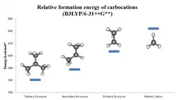 Order of stability of examples of tertiary (III), secondary (II), and primary (I) alkylcarbenium ions, as well as the methyl cation (far right).