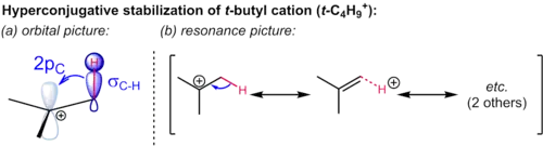 Hyperconjugation by neighboring alkyl groups stabilizes the t-butyl cation. The stabilizing interaction can be depicted as an orbital interaction or by resonance structures involving "no-bond" resonance forms. (For clarity, a dashed line is used to show that the hydrogen atom is still attached, although the formal C–H bond order in the hyperconjugative structure is zero.)