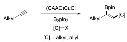 - ↑ Gao, Y.; Kim, N.; Mendoza, S. D.; Yazdani, S.; Vieira, A. F.; Liu, M.; Grotjahn, D. B.; Bertrand, G.; Jazzar, R.; Engle, K. M. (2022). "(CAAC)Copper Catalysis Enables Regioselective Three-Component Carboboration of Terminal Alkynes". ACS Catalysis. 12 (12): 7243–7247. doi:10.1021/acscatal.2c00614. PMC 10153597. PMID 37143933.
