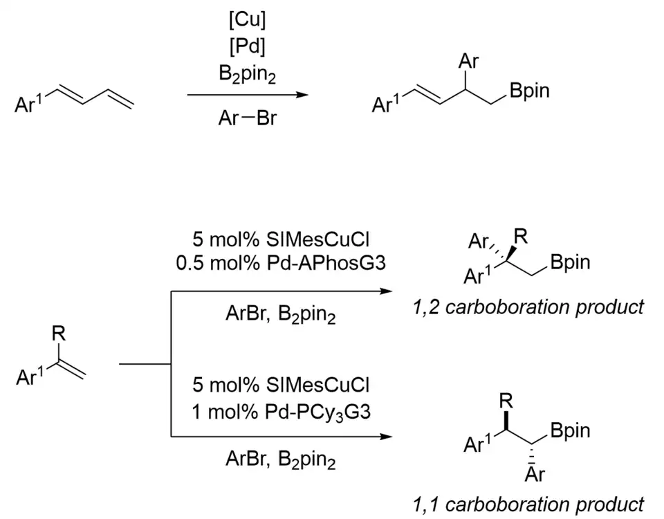 - ↑ Dorn, S. K.; Brown, M. K. (2022). "Cooperative Pd/Cu Catalysis for Alkene Arylboration: Opportunities for Divergent Reactivity". ACS Catalysis. 12 (3): 2058–2063. doi:10.1021/acscatal.1c05696. PMC 9540610. PMID 36212545.