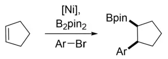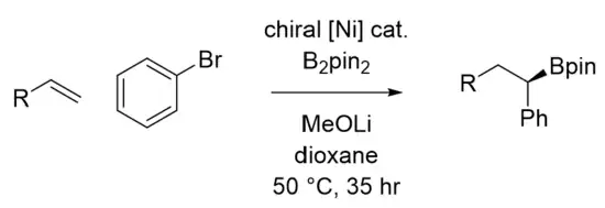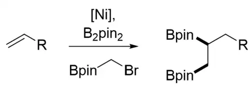 - ↑ Ye, Y.; Lin, Y.; Mao, N. D.; Yang, H.; Ye, X. Y.; Xie, T. (2018). "Recent progress in nickel-catalyzed carboboration of alkenes". Organic & Biomolecular Chemistry. 140 (9): 3223–3227. doi:10.1021/jacs.8b00881. PMC 6002770. PMID 29384373.