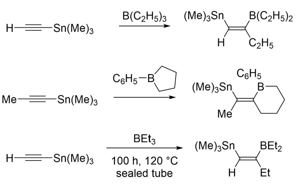 - ↑ Wrackmeyer, B.; Menz, G. (1977). "Organoborierung von Alkinylstannanen, III1 Zur Reaktion von Trialkylboranen mit Monoalkinylstannanen / Organoboration of Alkynylstannanes, III The Reaction of Trialkylboranes with Monoalkynylstannanes". Zeitschrift für Naturforschung B (in German). 32b (12): 1400. doi:10.1515/znb-1977-1209. S2CID 98409890.