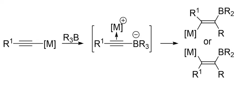 Wrackmeyer-type 1,1 carboboration is proposed to go through a zwitterionic intermediate, and this intermediate has been isolated and characterized in some cases.[4][5][6] However, the mechanism can be highly substrate and reagent dependent.