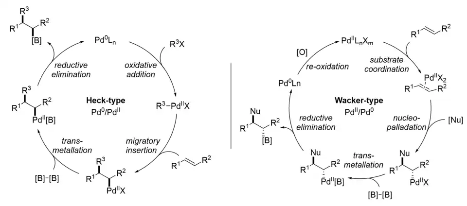 The mechanism of carboboration depends highly on the substrate and reagents utilized in the reaction. Shown below are examples of two types of Pd-catalyzed alkene 1,2 carboborations, Heck-type and the Wacker-type.[12] However, the Cu- and Ni-catalyzed reactions can proceed through similar mechanisms. These two mechanisms mainly differ in the oxidation state of the active catalyst and how the carbon group is delivered to the substrate: whether the C–C bond is formed via migratory insertion from the catalyst (inner sphere) or attack by an external nucleophile (outer sphere). Wacker-type carboborations, catalyzed by PdII, are much rarer than Heck-type. The first example of a Wacker-type 1,2 carboboration was reported by the Engle group in 2019.[13]