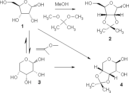 Kinetic reaction control results from 2-methoxypropene as the reagent. D-ribose in itself is a hemiacetal and in equilibrium with the pyranose 3. In aqueous solution ribose is 75% pyranose and 25% furanose and a different acetal 4 is formed.