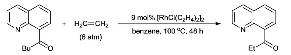 Compared with β-carbon elimination, oxidative addition of C-C bond is a more direct way of C-C bond activation. However, it is more challenging to do for the following reasons: 1) It forms two weak M-C bonds at the expense of breaking a stable C-C bond, so it is energetically unfavorable; 2) the C-C bond is usually hindered, which makes the metal center hard to approach. As a result, the cleavage of unstrained compounds that have been achieved is mainly focused on ketone substrates. This is because the C–C bond adjacent to the carbonyl of ketones is weaker and can be much more easily cleaved. It also benefits from the less steric hindrance from the planar structure of the carbonyl motif. Suggs and Jun are pioneers in this field. They found that an Rh(I) complex, [RhCl(C2H4)2]2, can be oxidatively inserted into the C–C bond of 8-acylquinolines at the 8-position to form relatively stable 5-membered rhodacycles. Subsequently, 8-acylquinoline can be coupled with ethylene to afford 8-quinolinyl ethylketone, which represented the first transition-metal-catalyzed scission of C–C bonds via oxidative addition.[11]
