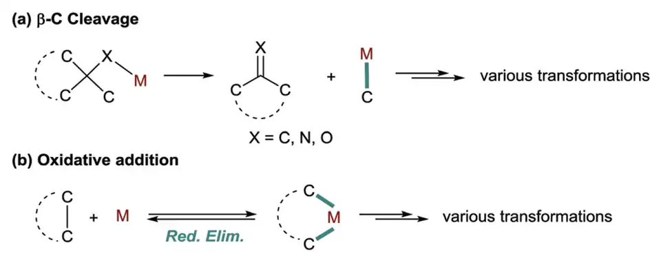 Generally speaking, there are two distinct mechanistic pathways that lead to C-C bond activation: (a) the β-carbon elimination of metal complexes. In this mechanism, a M–C intermediate and a double bond are formed at the same time; and (b) the direct oxidative addition of C–C bonds into low-valent metal adducts to form a bis(organyl)metal complex.