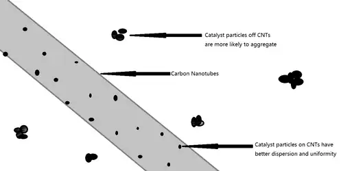 Carbon nanotube supported catalyst is a novel supported catalyst, using carbon nanotubes as the support instead of the conventional alumina or silicon support. The exceptional physical properties of carbon nanotubes (CNTs) such as large specific surface areas, excellent electron conductivity incorporated with the good chemical inertness, and relatively high oxidation stability makes it a promising support material for heterogeneous catalysis.[2]