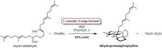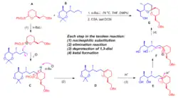 Multistep tandem reactions (or cascade reactions) are a sequence of chemical transformations (usually more than two steps) that happens consecutively to convert a starting material to a complex product.[28] This kind of organic reactions are designed to construct difficult structures encountered in natural product total synthesis.