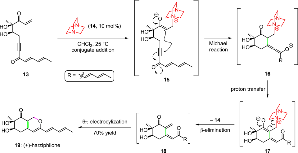 An organocatalytic cascade was employed in the total synthesis of the natural product harziphilone, reported by Sorensen et al. in 2004 (Scheme 3).[4][14] Herein, treatment of the enone starting material 13 with organocatalyst 14 yielded intermediate 15 via conjugate addition. Subsequent cyclization by the intramolecular Michael addition of the enolate into the triple bond of the system gave species 16, which afforded intermediate 17 after proton transfer and tautomerization. The cascade was completed by elimination of the organocatalyst and a spontaneous 6π-electrocyclic ring closure of the resultant cis-dienone 18 to (+)-harziphilone (19) in 70% overall yield.[4][14]