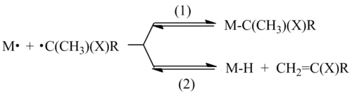 In general, reactions of organic free radicals (•C(CH3)(X)R) with metal-centered radicals (M•) either produce an organometallic complex (reaction 1) or a metal hydride (M-H) and an olefin (CH2=C(X)R) by the metallo radical M• abstracting a β-hydrogen from the organic radical •C(CH3)(X)R (reaction 2).[5] These organo-radical reactions with metal complexes provides several mechanisms to control radical polymerization of monomers CH2=CH(X). A wide range of metal-centered radicals and organo-metal complexes manifest at least a portion of these reactions.[6] Various transition metal species, including complexes of Cr(I),[7][8] Mo(III),[9] Fe(I),[10] V(0),[11] Ti(III),[12] and Co(II)[13][14][15] have been demonstrated to control molecular weights in radical polymerization of olefins.