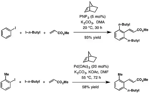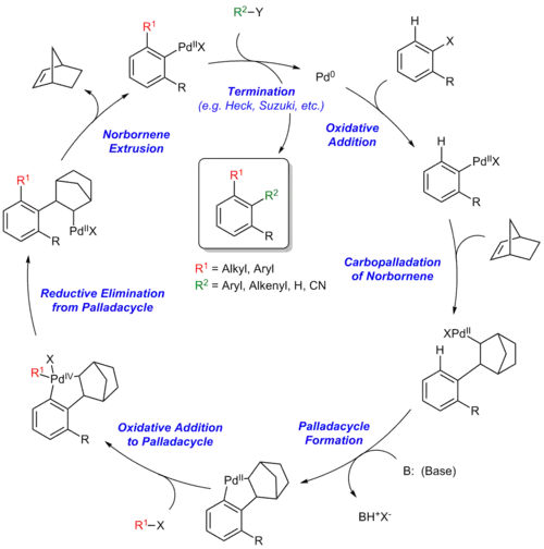 Initially, Pd(0) oxidatively adds into the C–X bond of the aryl halide. Subsequently, the arylpalladium(II) species undergoes carbopalladation with the norbornene. The structure of the norbornylpalladium intermediate does not allow for β-hydride elimination at either of the β-positions due to Bredt's Rule for the bridgehead β-hydrogen and the trans-configuration between palladium and other β-hydrogen.[6] Thereafter, the Pd(II) species undergoes electrophilic cyclopalladation at the ortho position of the aryl group. Subsequently, the palladacyclic intermediate undergoes a second oxidation addition with the alkyl halide coupling partner to form a Pd(IV) intermediate, which undergoes reductive elimination to forge the first C–C bond of the product. After β-carbon elimination of norbornene, the resultant Pd(II) species then undergoes a second C–C bond forming step via a Heck reaction or cross coupling with an organoboron reagent to afford the final organic product and close the catalytic cycle.[7]