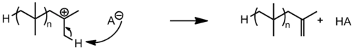 In polymer chemistry, cationic polymerization is a type of chain growth polymerization in which a cationic initiator transfers charge to a monomer, which then becomes reactive. This reactive monomer goes on to react similarly with other monomers to form a polymer.[2][3] The types of monomers necessary for cationic polymerization are limited to alkenes with electron-donating substituents and heterocycles. Similar to anionic polymerization reactions, cationic polymerization reactions are very sensitive to the type of solvent used. Specifically, the ability of a solvent to form free ions will dictate the reactivity of the propagating cationic chain. Cationic polymerization is used in the production of polyisobutylene (used in inner tubes) and poly(N-vinylcarbazole) (PVK).[4]