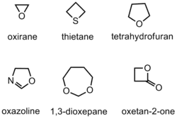 Heterocyclic monomers that are cationically polymerized are lactones, lactams and cyclic amines. Upon addition of an initiator, cyclic monomers go on to form linear polymers. The reactivity of heterocyclic monomers depends on their ring strain. Monomers with large ring strain, such as oxirane, are more reactive than 1,3-dioxepane which has considerably less ring strain. Rings that are six-membered and larger are less likely to polymerize due to lower ring strain.[6]