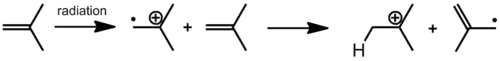 Ionizing radiation can form a radical-cation pair that can then react with a monomer to start cationic polymerization. Control of the radical-cation pairs is difficult and often depends on the monomer and reaction conditions. Formation of radical and anionic species is often observed.[5]