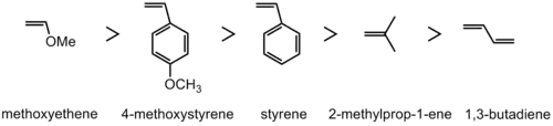 Cationic polymerization of olefin monomers occurs with olefins that contain electron-donating substituents. These electron-donating groups make the olefin nucleophilic enough to attack electrophilic initiators or growing polymer chains. At the same time, these electron-donating groups attached to the monomer must be able to stabilize the resulting cationic charge for further polymerization. Some reactive olefin monomers are shown below in order of decreasing reactivity, with heteroatom groups being more reactive than alkyl or aryl groups. Note, however, that the reactivity of the carbenium ion formed is the opposite of the monomer reactivity.[5]