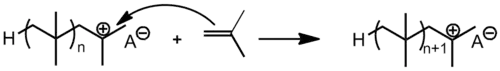 Propagation proceeds by addition of monomer to the active species, i.e. the carbenium ion. The monomer is added to the growing chain in a head-to-tail fashion; in the process, the cationic end group is regenerated to allow for the next round of monomer addition.[6]